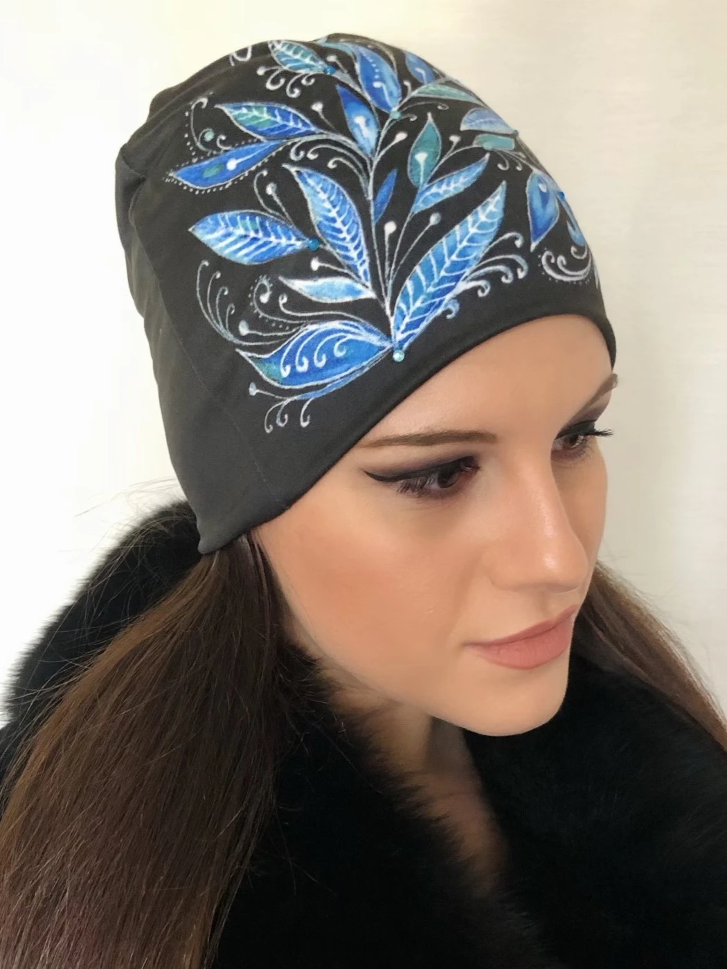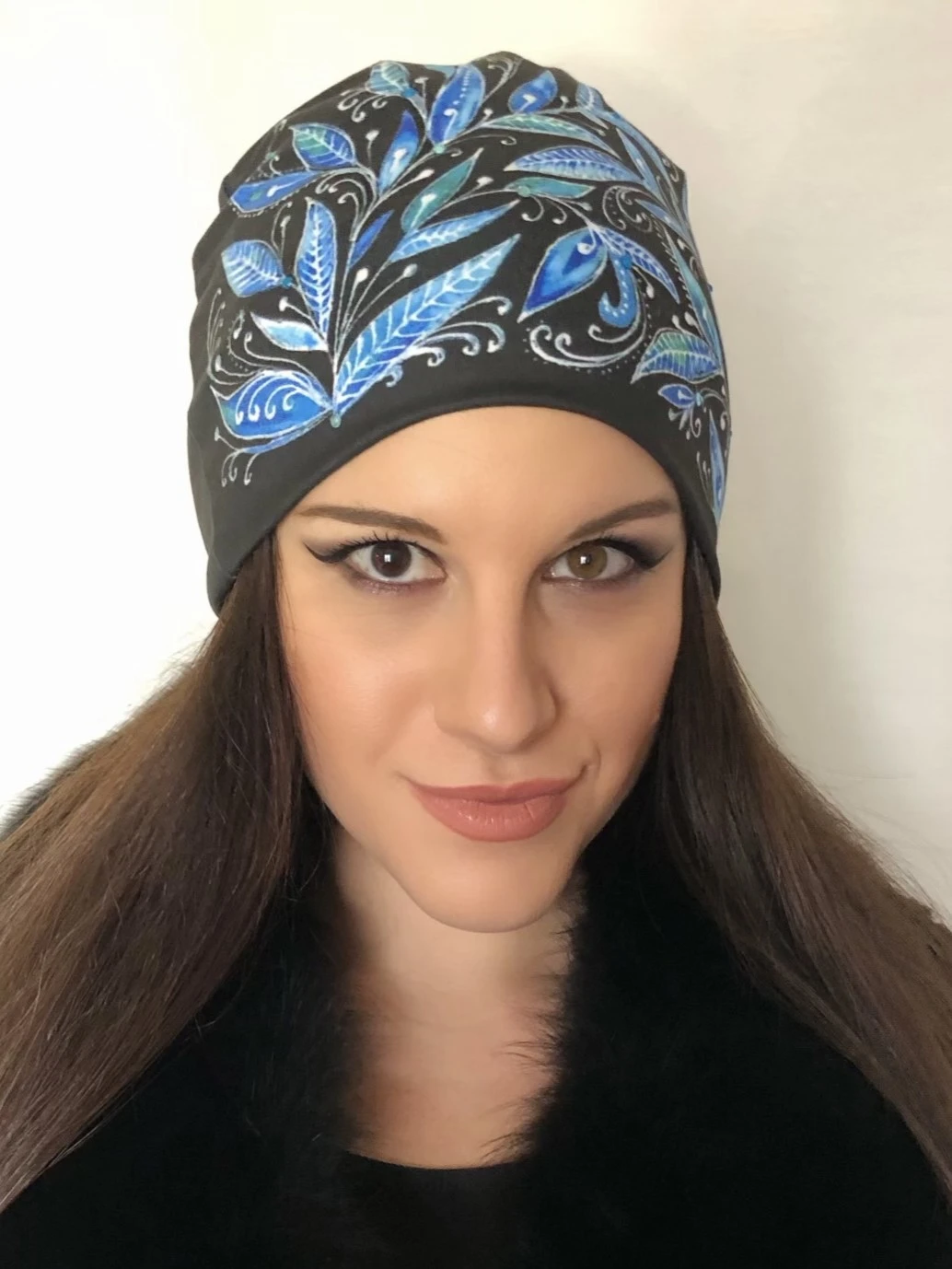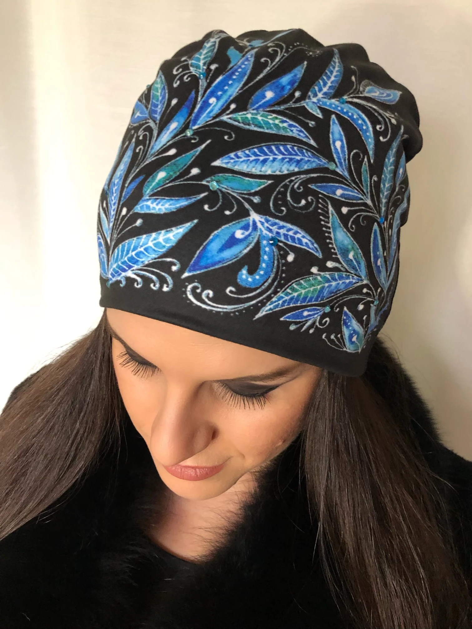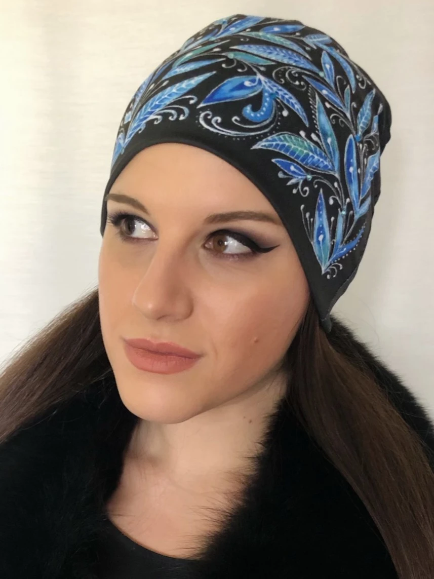 Čepice černá s modrými listy