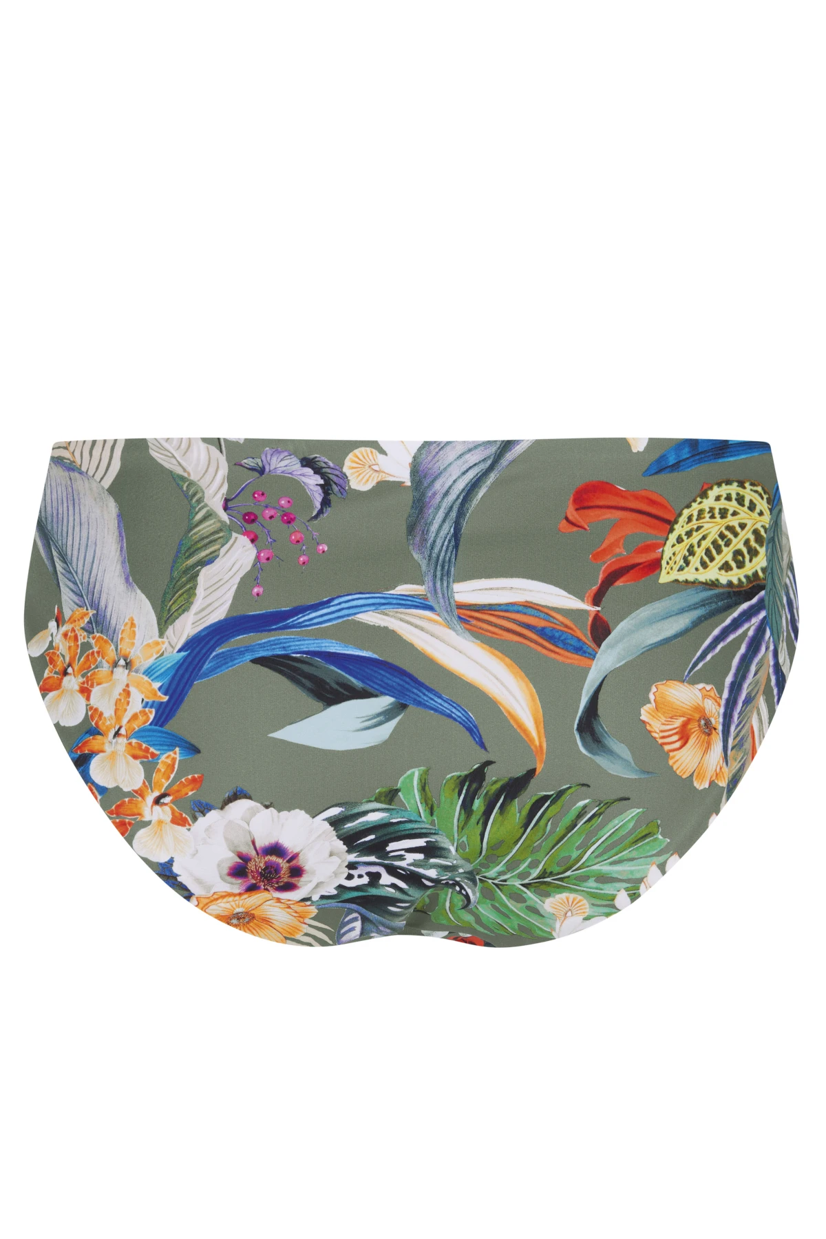 • plavková podprsenka s pestrým potiskem květů a listů tropických rostlin na olivově zeleném podkladu