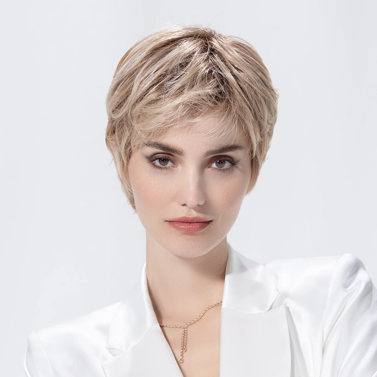 - rooted - u kořínků je paruka tmavší než je zobrazený odstín, vlasy mají odrost