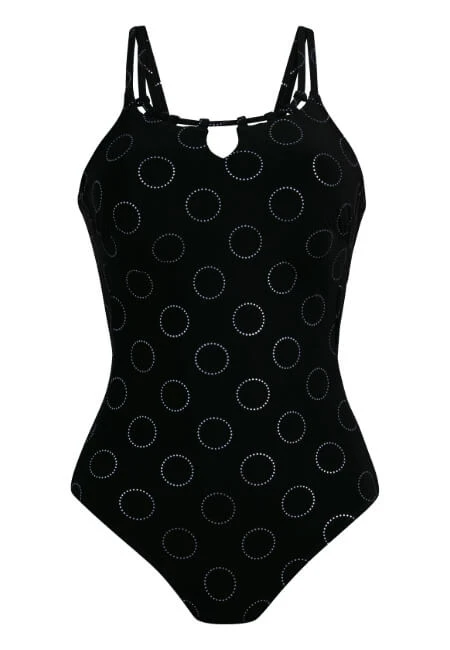 - jednodílné černé protetické plavky se stříbrným potiskem koleček