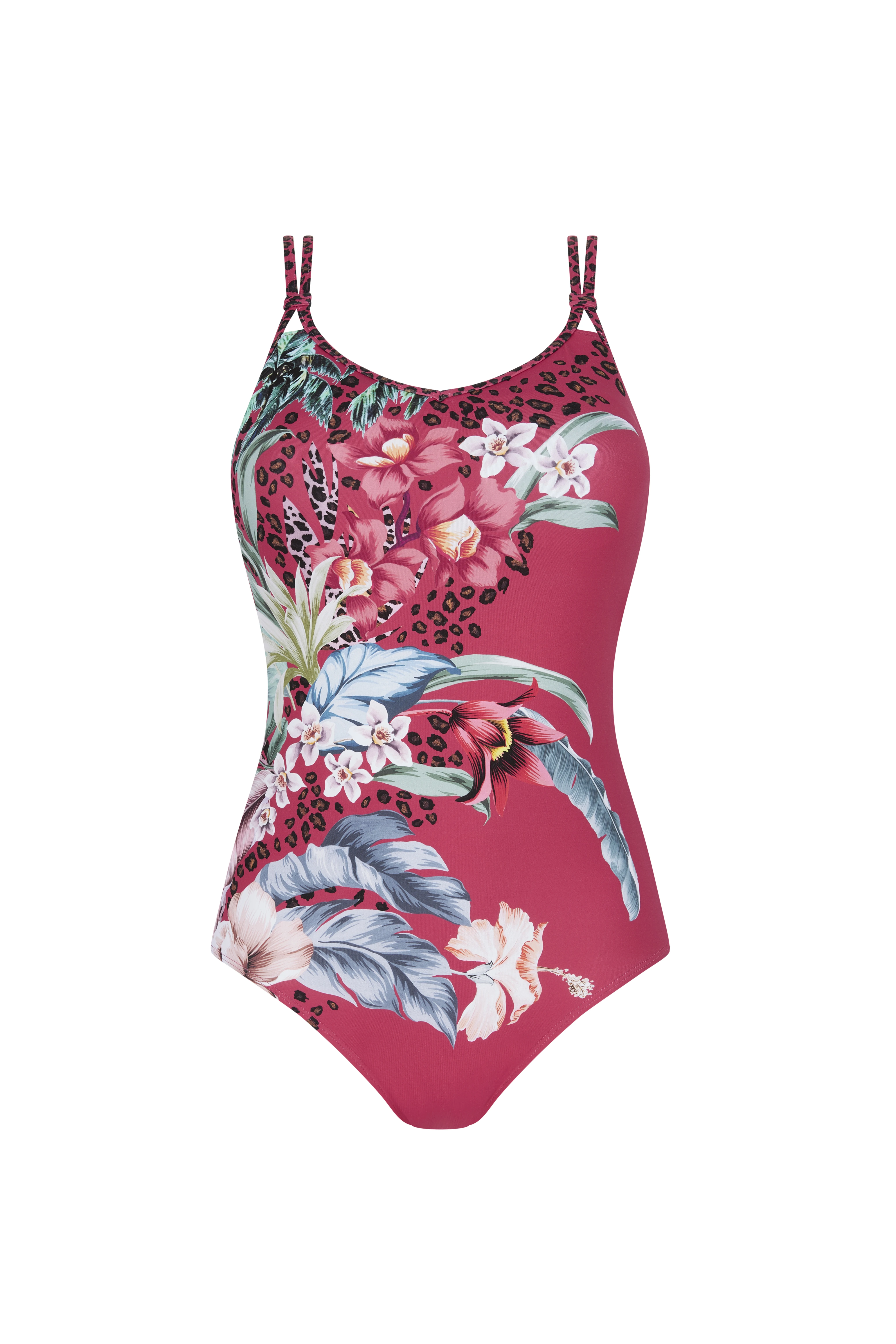 • barevné jednodílné plavky s pestrým potiskem květů tropické džungle na předním dílu