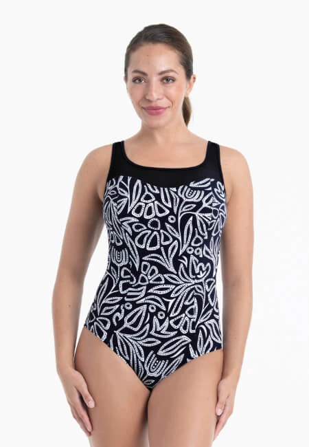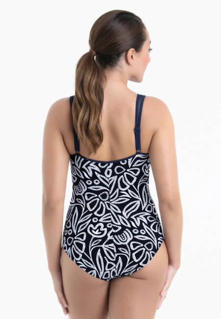 - jednodílné tmavě modré protetické plavky s bílým květinovým potiskem