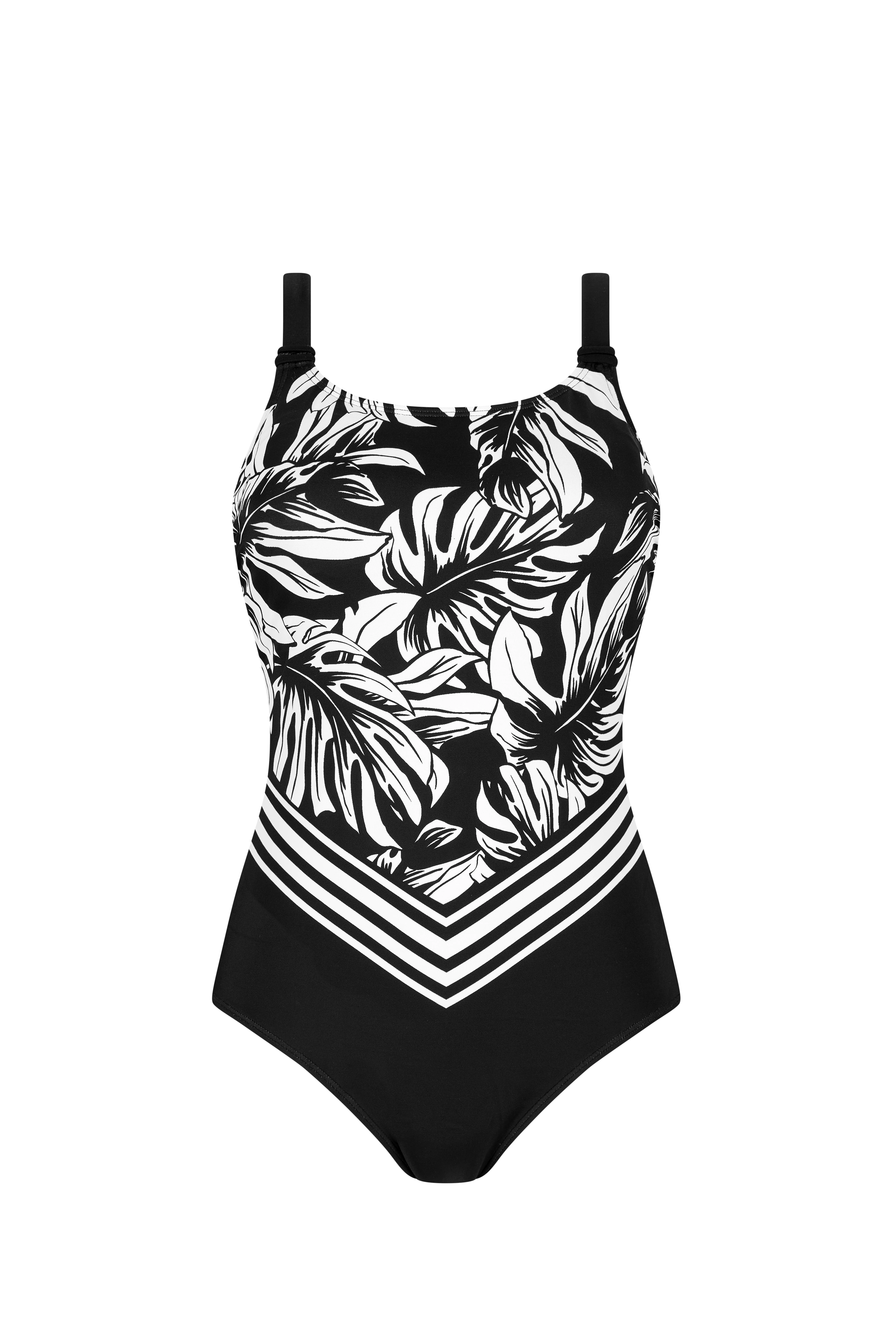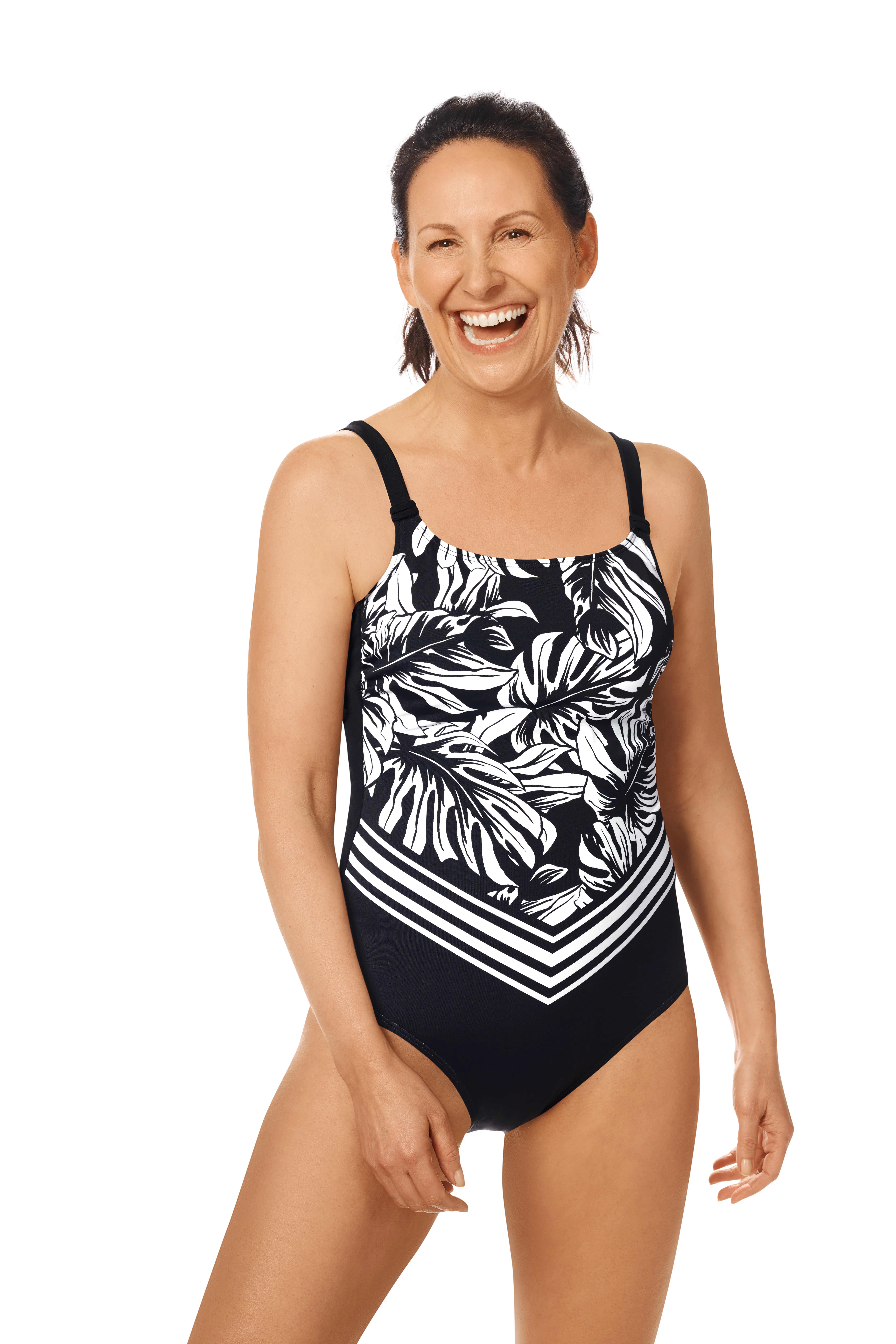 - elegantní jednodílné plavky s potiskem květin a černobílými proužky, které opticky zeštíhlují postavu
