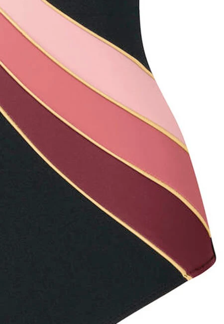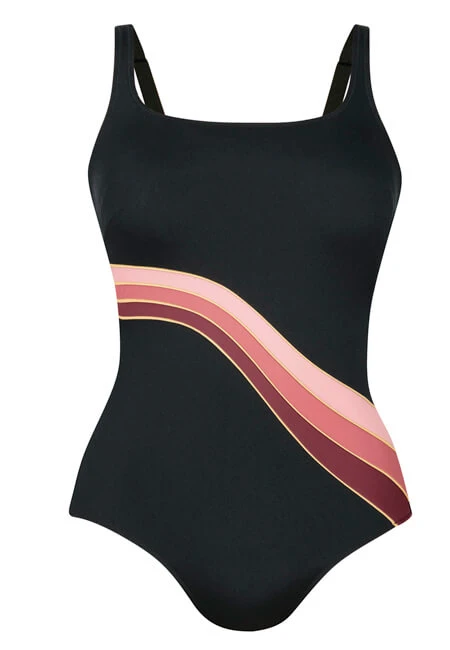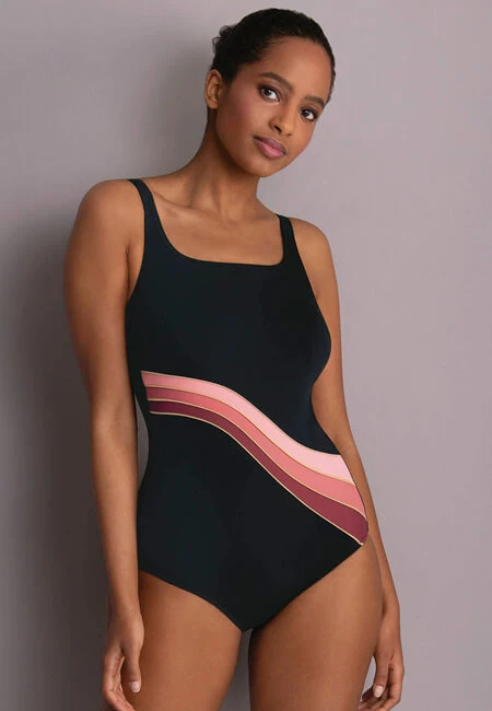 - elegantní černé plavky s výraznými kontrastními liniemi opticky zeštíhlují postavu