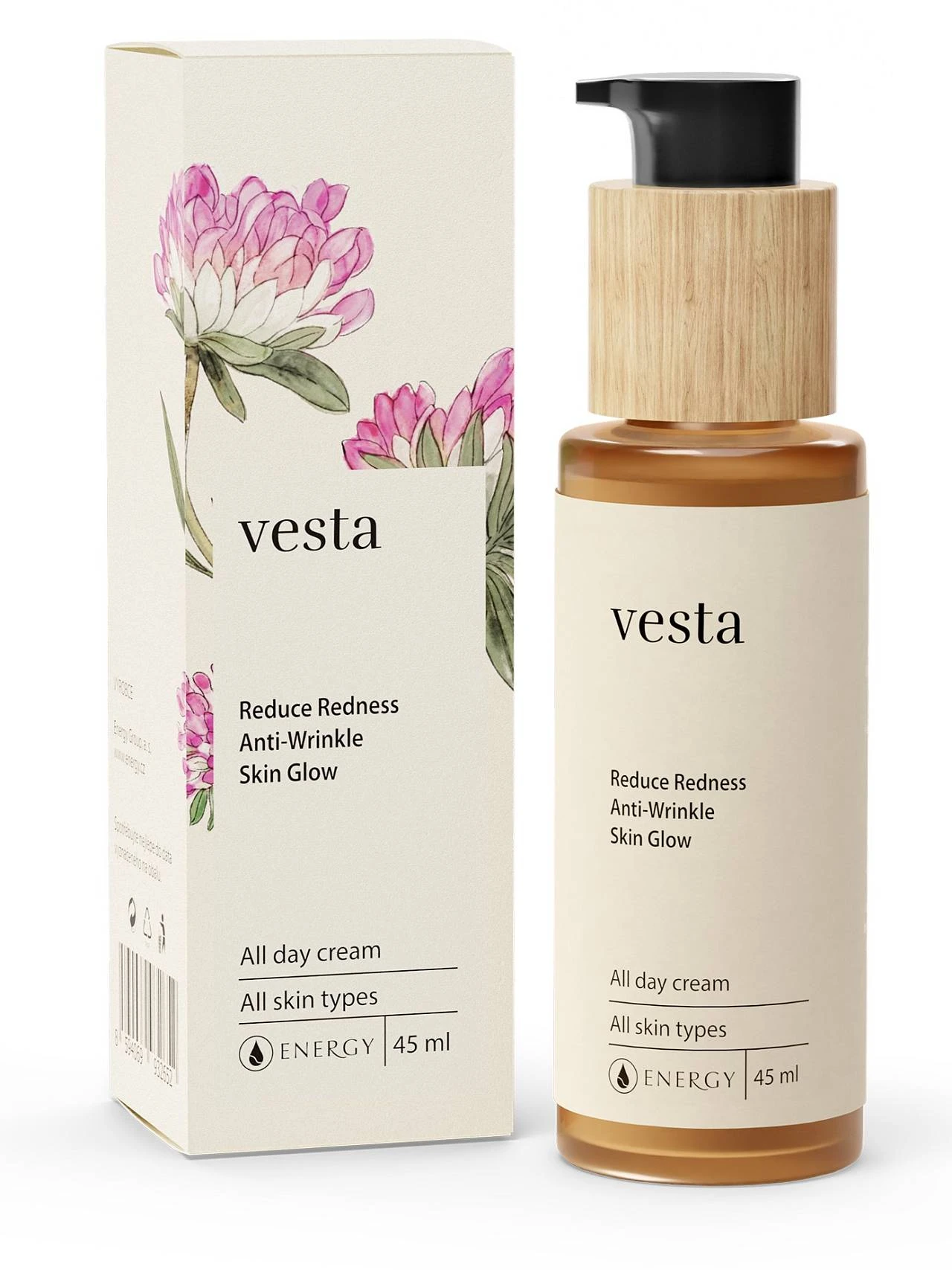 Vesta v sobě snoubí sílu tradiční fytoterapie, moderní biotechnologie a aromaterapie, díky nimž poskytuje dokonalou péči zarudlé pleti či pleti s kuperózou, která trpí nedostatečnou pevností a pružností krevních kapilár. Krém je lehký, dobře vstřebatelný, hydratační, zklidňující a pocitově ochlazuje pleť. Díky vysokému obsahu synergického komplexu bylin a dalších účinných látek blahodárně ovlivňuje regeneraci a dobrý stav všech vrstev pokožky. Výborně působí i proti vráskám a předčasnému stárnutí pleti. Je rovněž nejlepší volbou zklidňujícího pleťového krému po opalování.